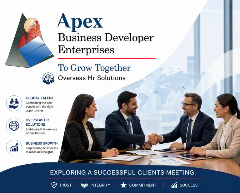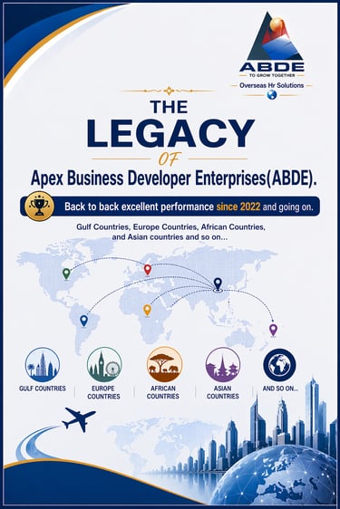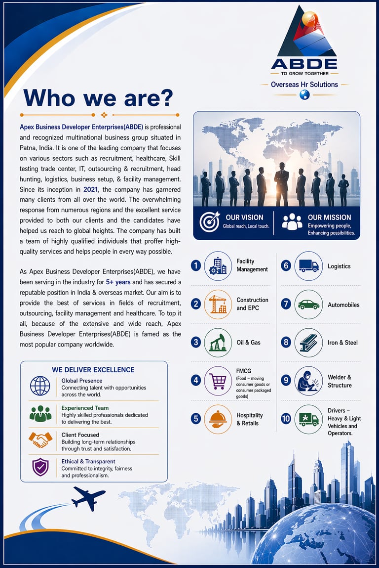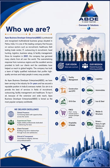 Apex Business Developer Enterprises(ABDE) is a multinational Recruitment Agency, established in the year 2022 & is a certified Overseas/ Domestic & multinational outsourcing, headhunting, executive search recruitment company with its head office in Patna, Bihar and branch offices in Mumbai, Chennai, Delhi etc. A total of around 1000+ aspirants from all categories and fields, ranging from professional, skilled, semi-skilled, unskilled and executive search have been provided with placement in GCC, Europe & Asian countries.